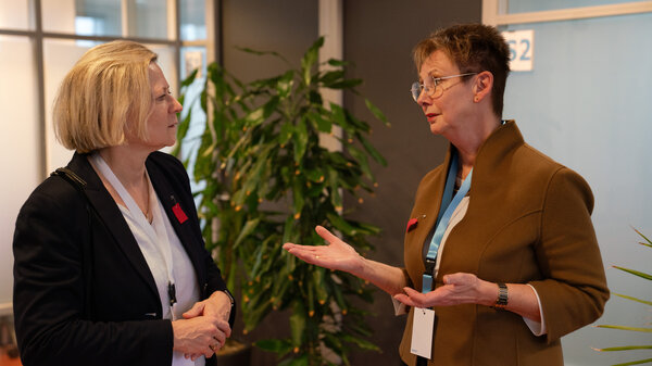 Director Anja Smit (right) in conversation with a director of the KNAW