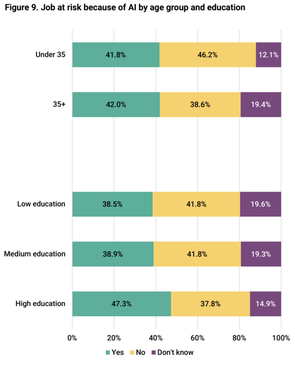 Concerns about the impact of AI on employment are widespread and cut across demographic groups. Between roughly 38% and 47% of respondents believe that AI poses a risk to jobs in their field, highlighting a shared sense of vulnerability. Interestingly, younger respondents tend to feel slightly less at risk than older groups, while highly educated individuals are among those most likely to perceive potential threats to their employment.
